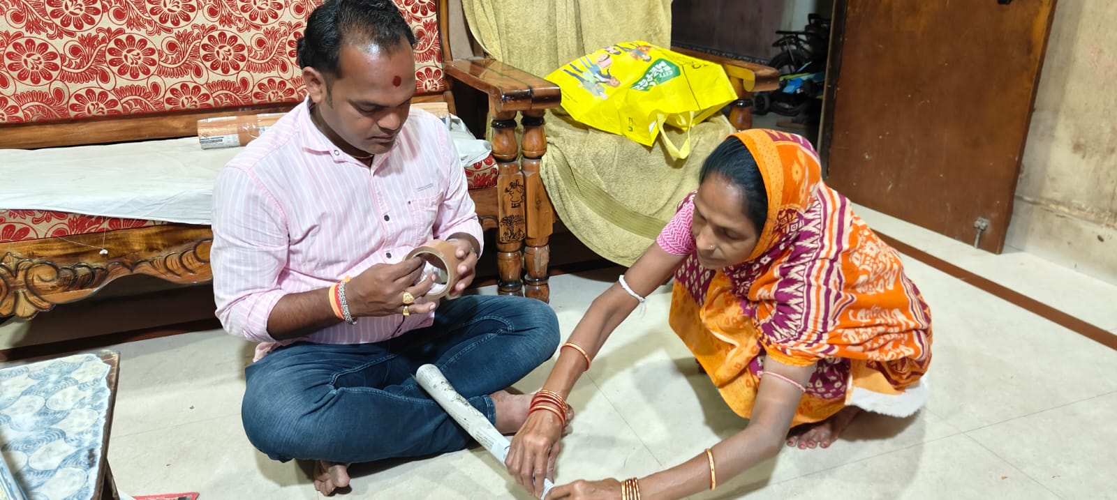 Chitranjan learned the art sitting beside his father and grandfather from the age of seven. Today, he works alongside his mother, who helps prepare the canvases while he paints the intricate mythological scenes — stories of Lord Jagannath, Krishna Leela, and episodes from the Ramayana. Each painting can take anywhere from two weeks to three months depending on the size and complexity of the narrative.